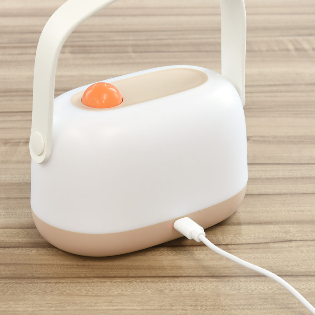 充電式のルームライトです。ライト上部のオレンジ色のボタンを押すと点灯、消灯ができ、ボタンとまわすと明るさの調整ができます。